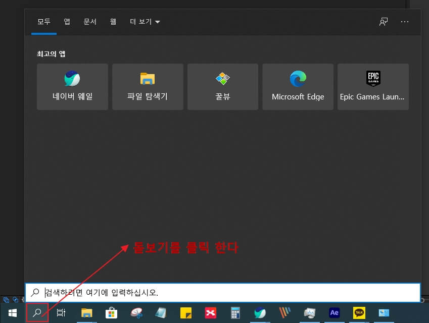 1. 윈도우 좌측 하단에 돋보기 모양을 클릭하면 윈도우 안에 기능들을 검색할 수 있는 창이 뜬다.