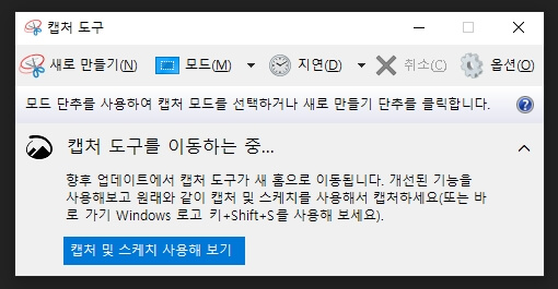 ※유용한 기능으로 캡처 프로그램 하단에 '캡처 및 스케치 사용해 보기'가 있는데 이 기능은 캡처 후 캡처 이미지에 낙서 또는 펜으로 필기가 가능하다.