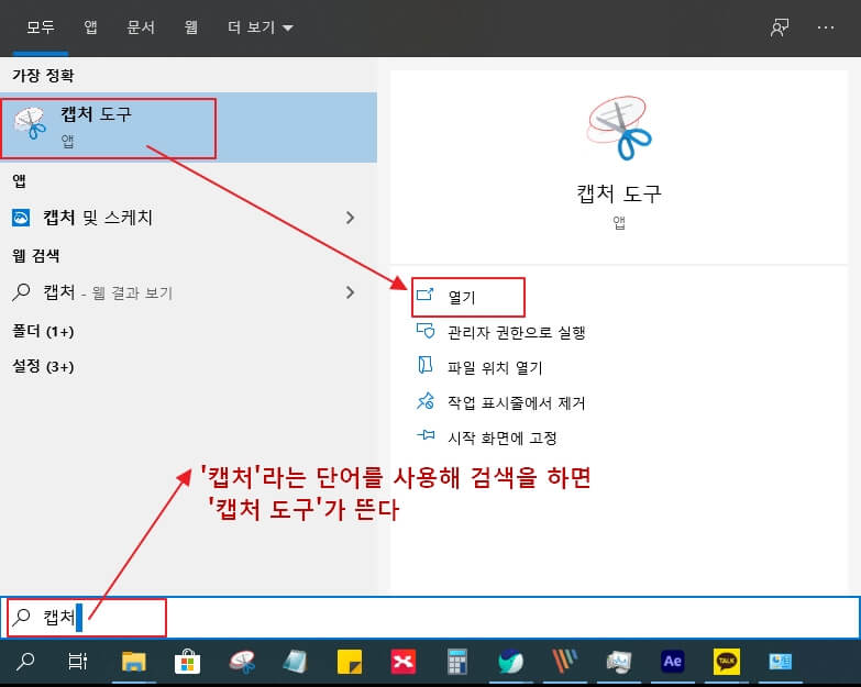 2. 돋보기에 '캡처'라는 단어를 치면 화면에 '캡처 도구'가 나타난다. 이 '캡처 도구'를 열기 도는 클릭을 해서 프로그램을 실행시킨다.