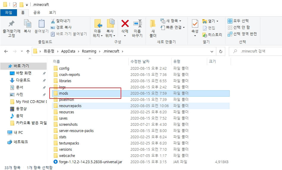 . minecraft폴더에 들어가서 mod폴더를 만든 후 복사한 모드를 붙여 넣기 한다.