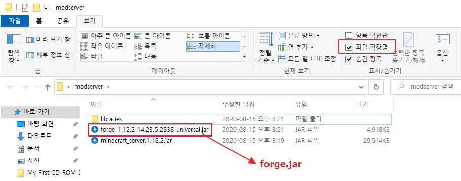 modserver 폴더에 들어가 보면 3개의 파일이 있다. 그중에 Forge 1.12.2. jar파일을 forge.jar로 수정한다. 파일 확장명이 안 보이면 폴더 상단에 파일 확장명을 체크해주면 된다.
