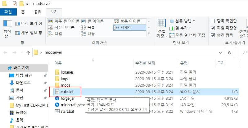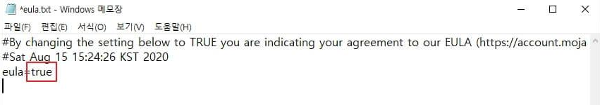 modserver 폴더로 들어가면 몇 가지 파일들이 설치가 되었을 것이다. 그중에 eula.txt를 실행하면 메모장이 열릴 텐데, eula=false를 eula=true로 바꿔준다.
