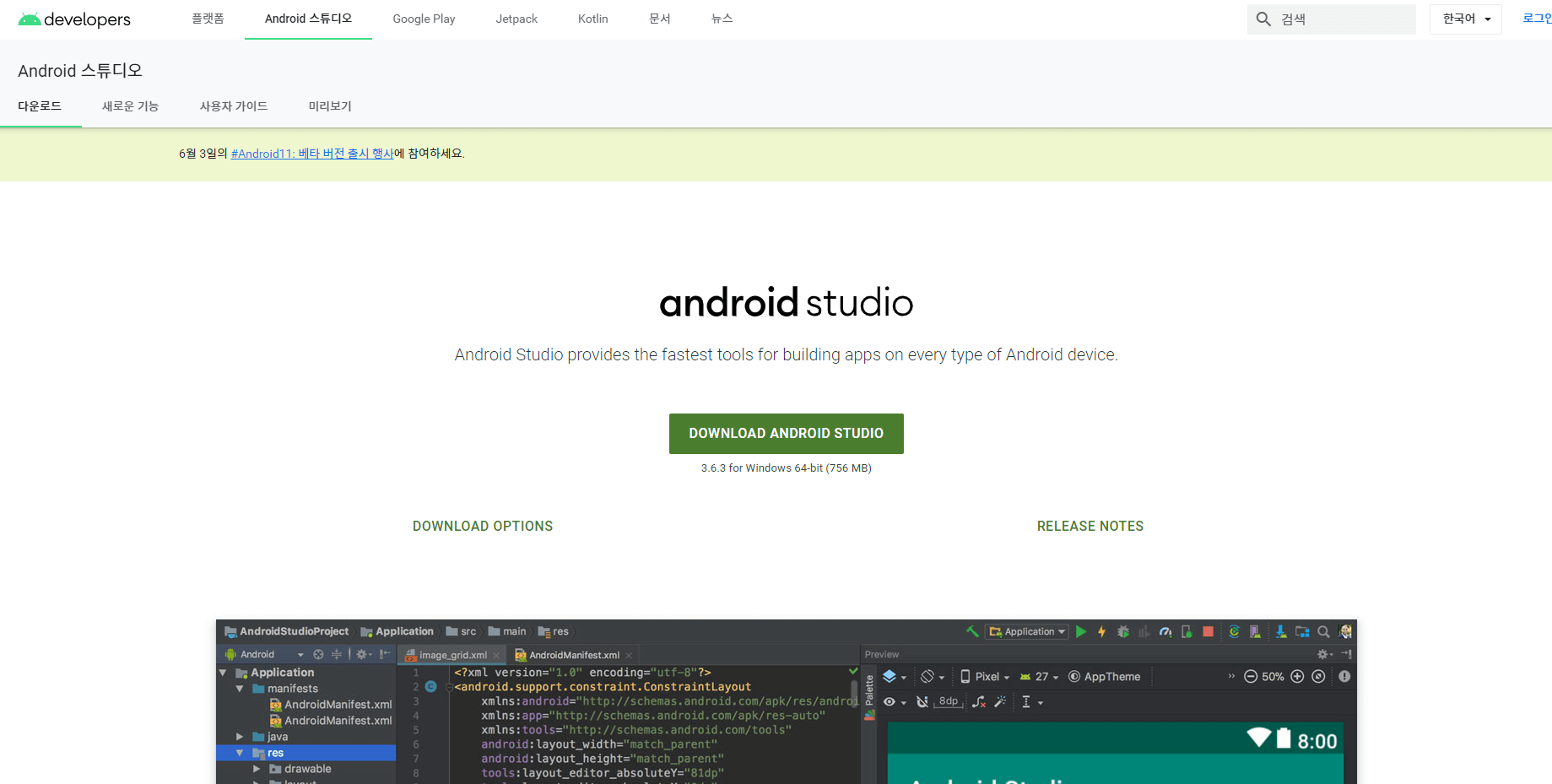 중앙에 DOWNLOAD ANDROID STUDIO를 클릭한다.