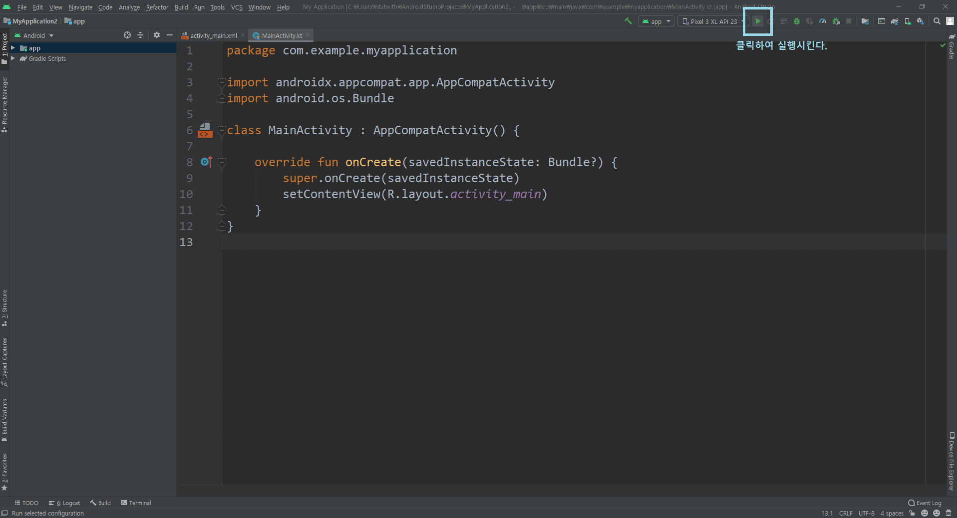 12. 우측 상단에 Pixel 3 XL API23 (자신이 설치한 기기명)이 생겼다.