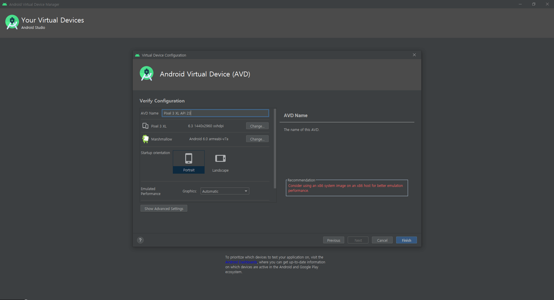 AVD Name에 원하는 기기명을 정할 수 있다.