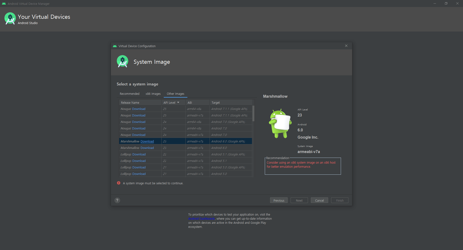 Marshmallow를 선택 후 Download를 한다. (원하는 OS를 설치하면 된다)