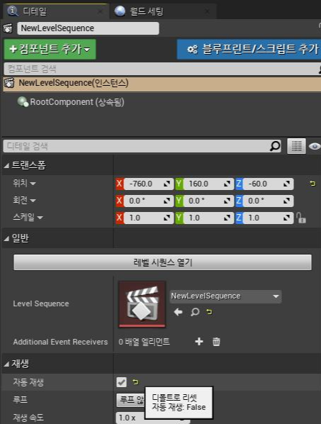 디테일 창에서 재생 탭에 자동재생을 체크해준다.