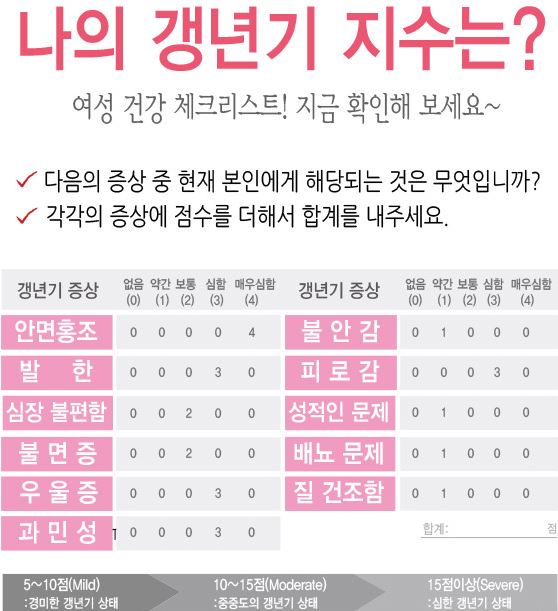 불가피한 폐경에는 증상 완화에 도움이 될 수 있는 건강기능식품을 적절히 관리하는 것도 좋은 방법이다. 다만 다양한 건강기능식품을 선택하기 전에 개인의 갱년기 지수를 꼼꼼히 체크하는 지혜가 필요하다.
