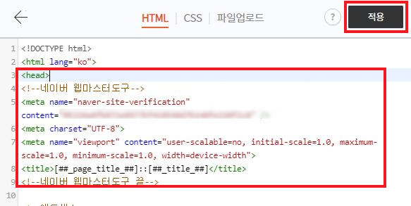 그리고 <!--네이버 웹마스터 도구-->와 <!--네이버 웹마스터 도구 끝-->은 주석 처리이다.