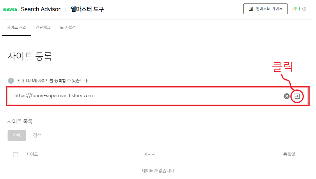 티스토리 블로그를 개설하고 내가 쓴 게시물들을 네이버에서 검색이 가능하게 하려면 네이버 서치 어드바이저의 웹마스터 도구를 이용하여 등록을 해야 한다.