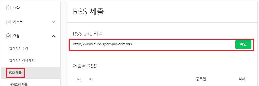 10. RSS 제출 메뉴를 클릭하면 RSS URL 입력란이 나온다.