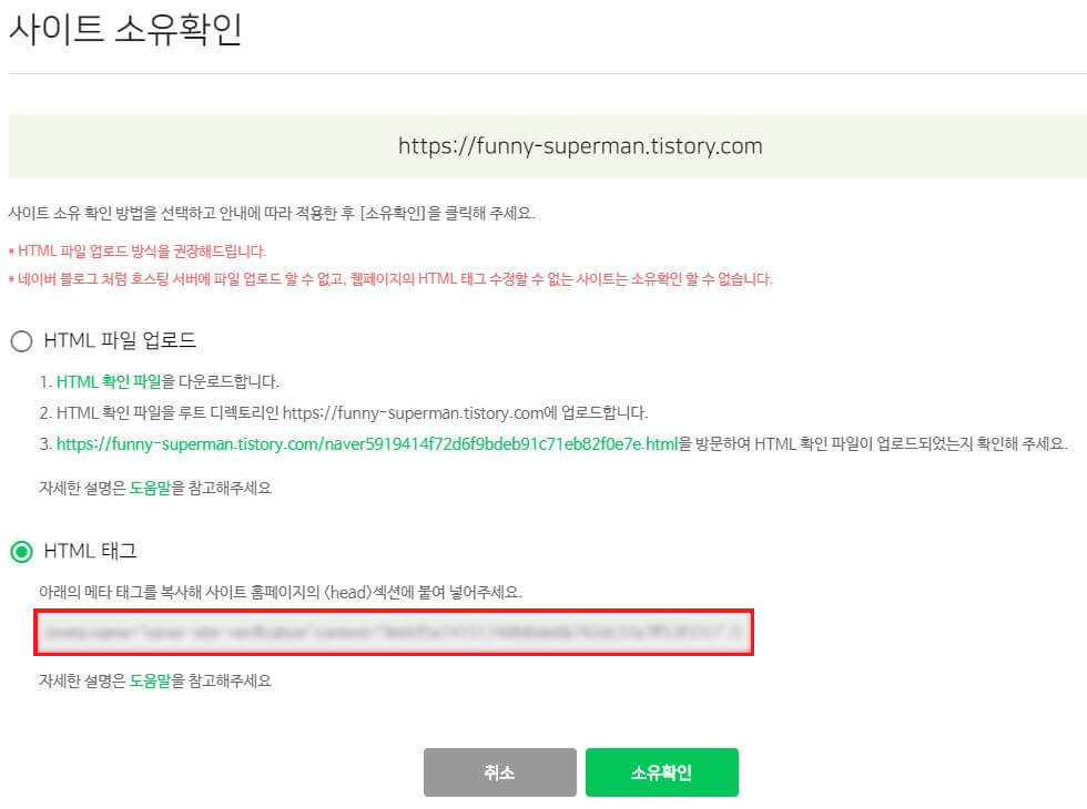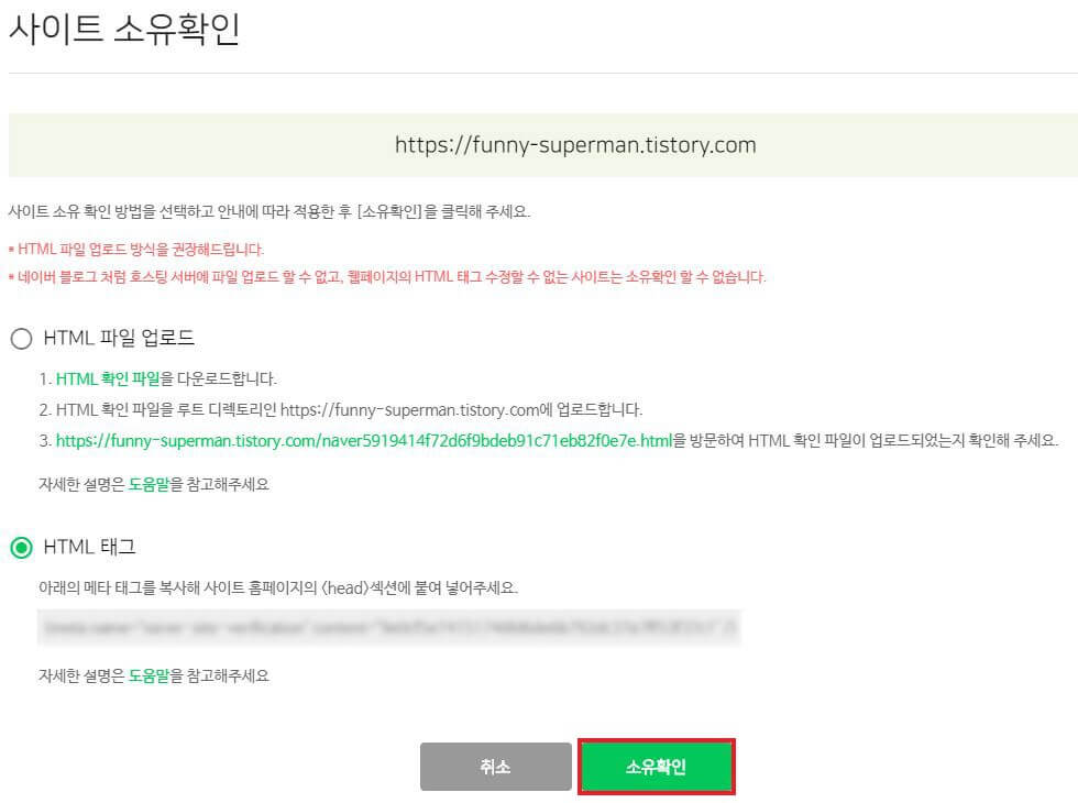 8. 다시 네이버 웹마스터 도구로 가서 하단 소유확인을 클릭한다.