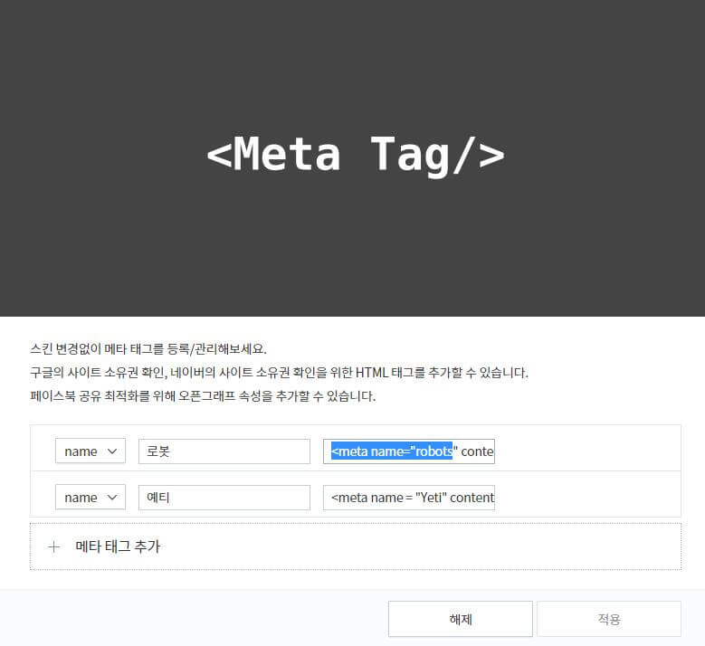 티스토리 블로그 관리 홈→플러그인→메타 태그 등록