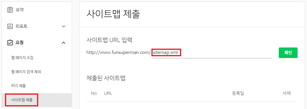 사이트맵 URL 입력 부분에 sitemap.xml을 적고 확인을 누른다.