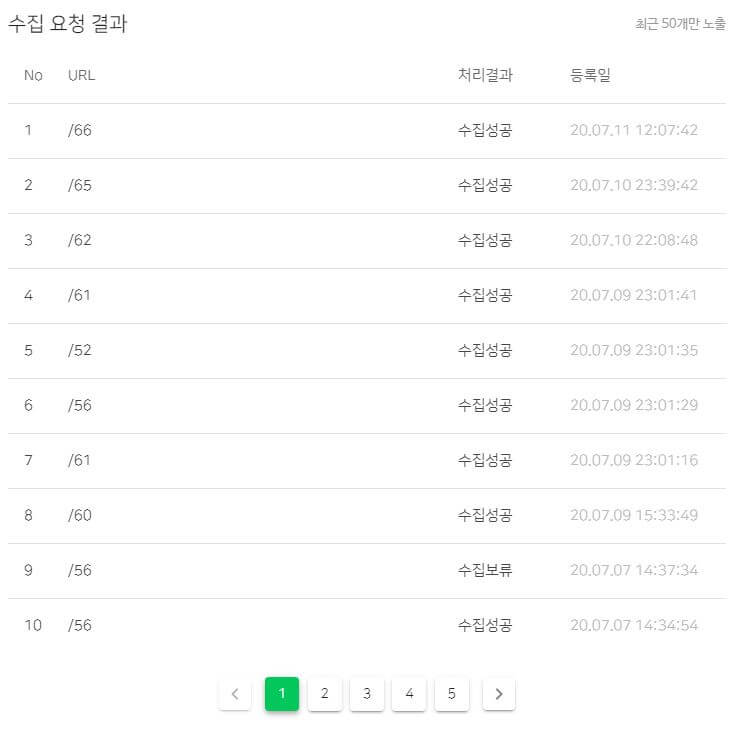 처음 등록을 하고 나면 수집 요청만 뜨고 수집 성공으로 바뀌지 않을 수가 있는데 시간이 지나면 수집 성공으로 바뀌었다. 그리고 수집 보류가 뜰 경우 시간이 지나고 다시 요청하면 수집 성공으로 바뀌었다.