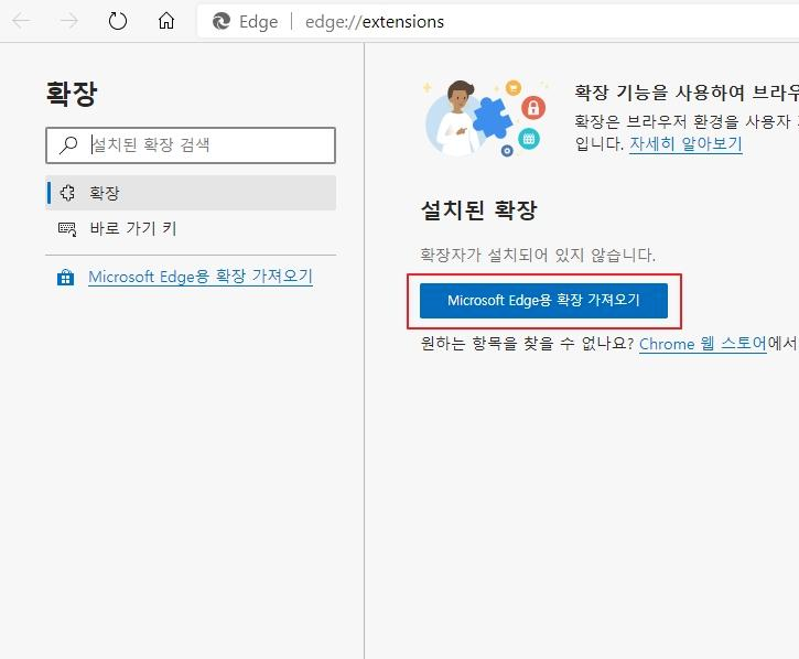 우측에 'Microsoft Edge용 확장 가져오기'를 클릭한다.